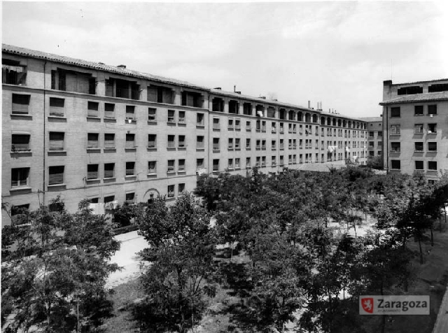 En 1941 se premia el plan presentado por dos jóvenes arquitectos zaragozanos con poca experiencia profesional previa: Alejandro Allanegui Félez (titulado en 1934 y muy vinculado a Regiones Devastadas) y José de Yarza García (titulado en 1933). La construcción del grupo de viviendas se realiza entre los años 1942 y 1945.