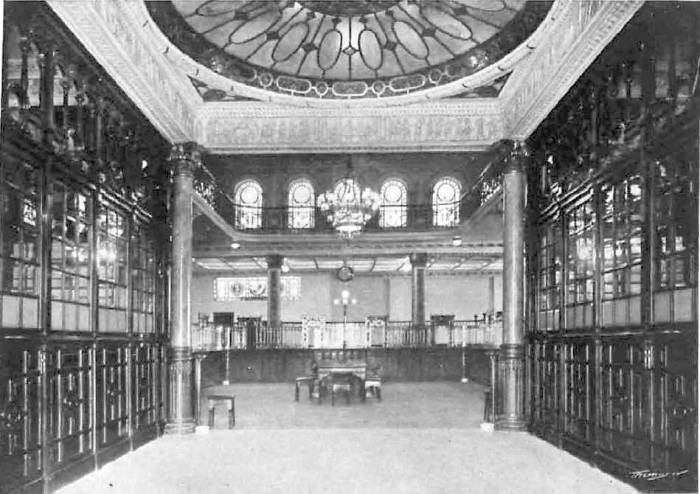En el interior, Miguel Ángel Navarro mantiene la misma propuesta formal aunque algo simplificada. El patio de operaciones es amplio, diáfano, con los mostradores dispuestos en forma de U en torno del mismo. El segundo nivel, al que se accedía mediante escaleras algo más discretas que en otros casos similares, era también espacialmente generoso y se remataba mediante una cubierta acasetonada que armonizaba el neorrenacentismo estético del conjunto.