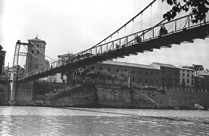 El puente de “Piedra” y el de “Hierro” dieron suficiente capacidad para atravesar el Ebro a peatones y vehículos durante años. Sin embargo, el segundo quedaba relativamente aguas abajo del curso del río por la ciudad y para algunos zaragozanos no resultaba cómodo llegar hasta lugares como la arboleda de Macanaz o las instalaciones de los baños del Ebro. Para ello utilizaban el servicio de barcas conocido como del “Tío Toni”.