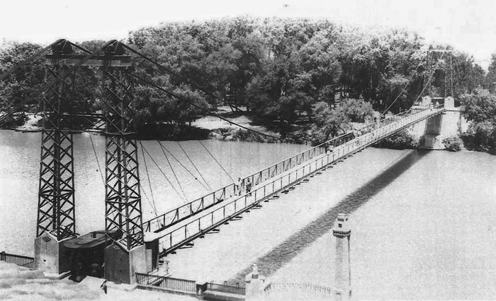 En 1935 el Ayuntamiento se planteó la posibilidad de construir una pasarela, con concesión de pago, que sirviera para cubrir esta necesidad. La guerra civil retrasó su construcción, que no finalizó hasta el año 1941. El proyecto correspondió al ingeniero Luis Fuentes López, quien planteó una airosa solución de puente colgante metálico sustentado gracias a cuatro cables y cuatro torres de hierro en celosía sobre pilares de piedra.