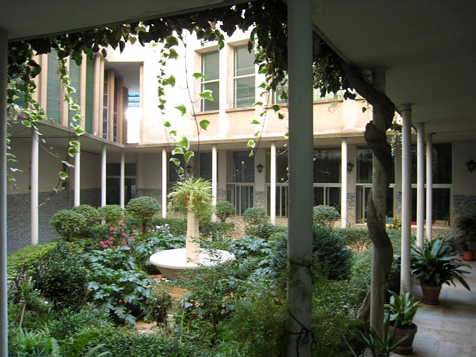 Los autores plantean el edificio en dos alas en V y desigual desarrollo correspondientes a las calles Corona de Aragon y Maestro José Serrano. Estas alas se dedican a aulas, espaciosas y luminosas. Entre ellas, un cuerpo central acoge los espacios comunes y, en un patio interior, el claustro de la clausura. La distribución general se lleva a cabo mediante la rotonda a la que se accede desde la puerta de acceso principal resuelta en chaflán.