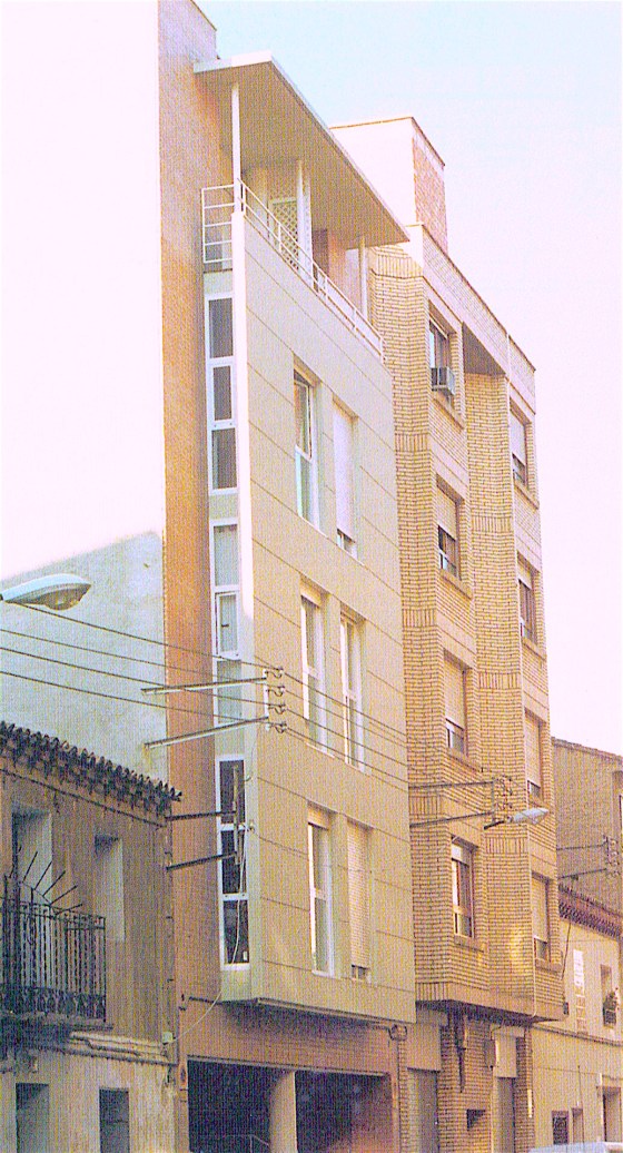 Este pequeño edificio de viviendas situado en pleno barrio de las Delicias es un buen ejemplo de la manera cómo las viviendas colectivas comienzan a reflejar en sus planteamientos un sentido más rico formalmente. Fue proyectado por Emilio Rivas Soria en 1990.