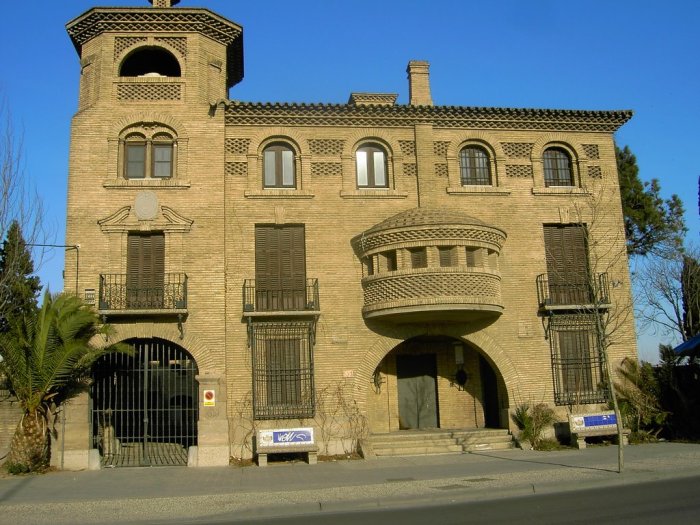 Las referencias históricas son evidentes en la fachada: el uso exclusivo del ladrillo, el trazo de los arcos, la decoración en esquinilla, el frontón partido con decoración heráldica…, y tantos otros detalles conjugados con total desenfado. Pero es en el interior donde queda plenamente de manifiesto el interés por la arquitectura histórica puesto que ya no se trata de recreación sino de reutilización. Así, algunos de los artesonados, de las columnas y de otros elementos constructivos proceden directamente de edificios históricos como el palacio de los marqueses de Osera.
