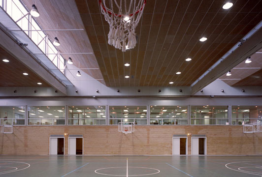El elemento central del pabellón es la pista polideportiva capaz tanto para competiciones como, oportunamente compartimentada en tres espacios independientes, para entrenamientos o actividades formativas. Para adecuar esta compartimentación, el autor dispone una cubierta en dientes de sierra con ventanales que iluminan la pista desde el norte.