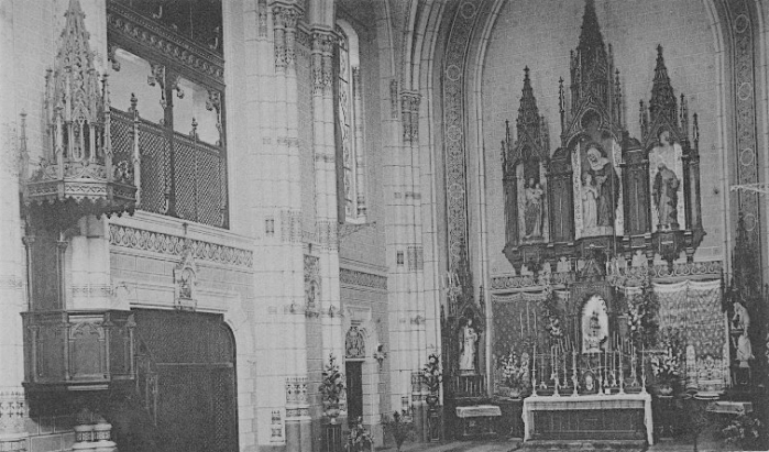 En el interior del templo se mantiene sin cambios la propuesta neomedievalista, si bien ahora los detalles ornamentales de procedencia gótica son los dominantes.