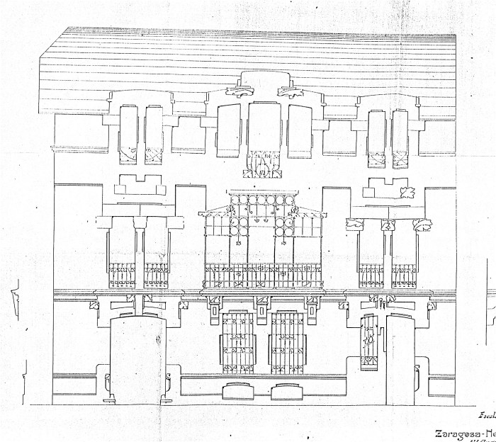 En el cuerpo central, de abajo hacía arriba, se encontraban los vanos rebajados del semisótano abiertos en el zócalo de piedra, unas ventanas pareadas, el gran mirador de forja ya señalado y el remate, abierto en arco tripartito y con un arco rebajado que rompía la cornisa.
