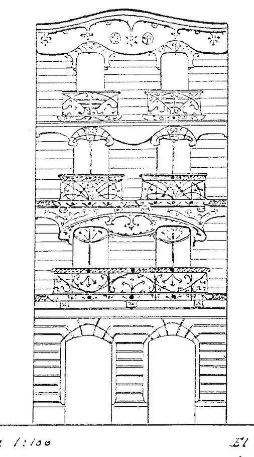 La fachada estaba enlucida con un aplantillado de bandas horizontales sobre los que se inscribe la abundante decoración de motivos vegetales.